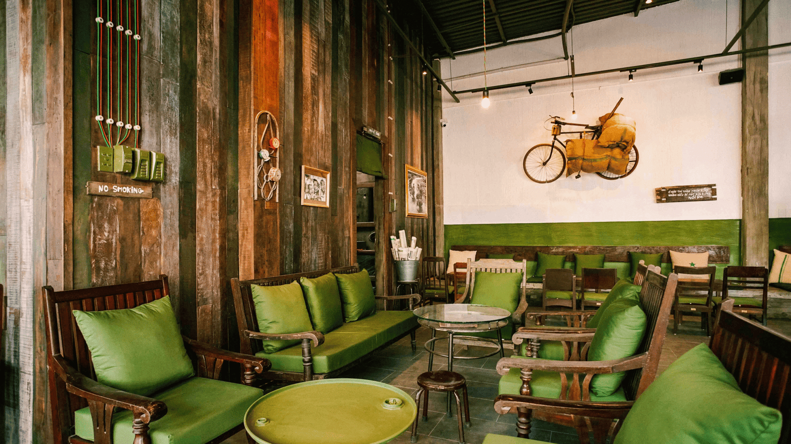 Stepping into Cong Cafe feels like stepping into a different era. Its interiors are filled with relics from the 1980s: worn-out books, military-style mugs, antique radios, and green army helmets. These vintage touches create a warm and nostalgic atmosphere that instantly transports you to old Vietnam.