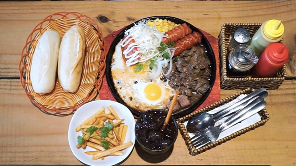Bò né (Vietnamese steak and eggs): Served on a sizzling pan with pâté, fresh baguette, and a side of greens, bò né is the perfect breakfast to start your day.