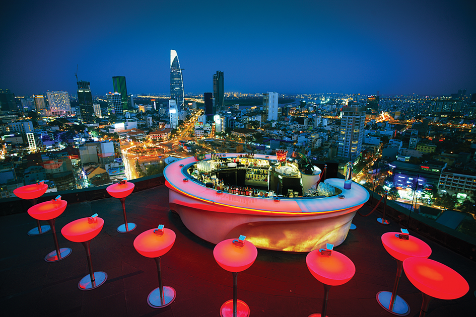 Chill Sky Bar, located on the 26th floor of the AB Tower in Ho Chi Minh City, offers stunning views of the Saigon skyline. It’s known for its vibrant atmosphere, expertly crafted cocktails, and top-notch DJs, making it a popular destination for both locals and tourists looking to enjoy a night out. Chill Sky Bar is situated in the AB Tower, featuring beautiful night views and a spacious environment that allows guests to fully appreciate the sparkling beauty of Saigon at night.