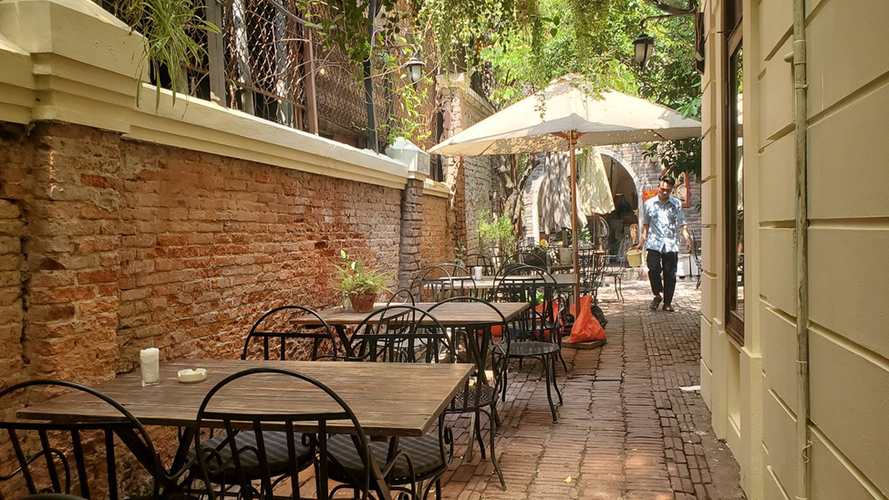 Xofa Café & Bistro comprises two two-story buildings connected by a charming courtyard. This courtyard has become a popular spot for young people to take photos, thanks to its beautiful features, including red brick walls and an open-air staircase adorned with floral tiles, reminiscent of a classic Western-style café.