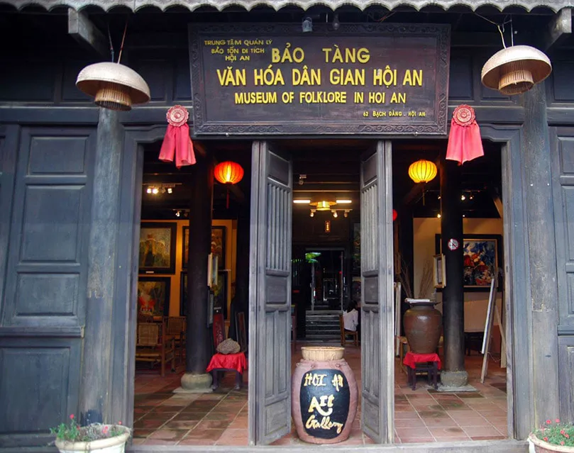 Hoi An Folklore Museum is a two-story building featuring traditional architectural design, with entrances leading to both Nguyen Thai Hoc and Bach Dang streets. Inside, the museum houses a collection of 490 artifacts that showcase various aspects of folk culture, including visual arts, performing arts, traditional crafts, and everyday folk activities.