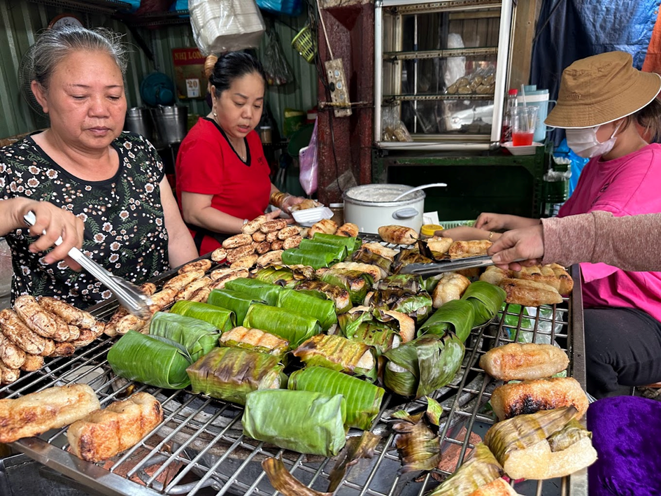 Chuoi Nep Nuong, bananas are wrapped in pandan leaves so they retain their chewy texture and delicious flavor. A simple snack but also adds a lot of energy to your journey to explore Saigon.