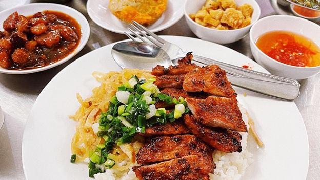 The 1975-founded Thuan Kieu restaurant was the first to introduce side dishes such as grilled chicken, braised shrimp, and snakehead fish to traditional broken rice, notably the grilled chicken dish and pork rib. The meal is uniformly marinated with spices in this instance, and the outside skin is expertly grilled until it turns a stunning golden brown. We may experience the incredibly alluring fat, scent, and tenderness of the pork rib when we eat it with the tender, flexible broken rice. Simple yet really tasty broken rice meals are served to diners in a large, spotless dining area. Thuan Kieu has 6 branches, so you can find the nearest location in Google or their website to enjoy this meal.