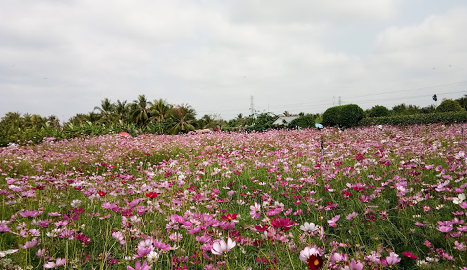 The garden spans a large area of 1.1 hectares, with flowers planted alternately in separate rows. It is beautifully adorned with various decorative elements such as swings and traditional three-plank boats.