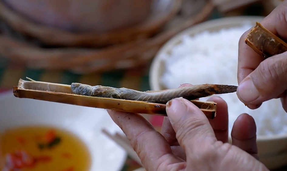 Just use your hands to tear the reed tube, separate the fish and slowly sip it with fish sauce.